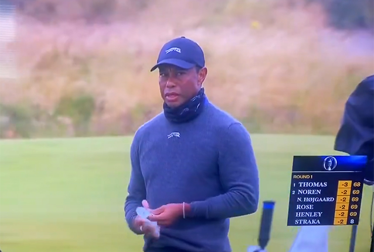 Woods, who got off to a four-over start through his first eight holes in some trying conditions at Royal Troon, didn’t exactly look comfortable in the cold weather. He began par-par-birdie to reach one under, holing a long bomb from off the third green that produced quite the roar.