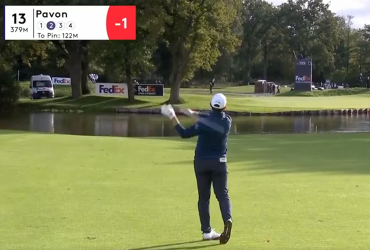 Pavon shanked his approach, and it was a miracle that his golf ball stayed dry. It rattled around in the trees before settling in the rough. And it drew quite a reaction from the Sky Sports crew, in particular, on-course reporter Wayne “Radar” Riley. Have a look and listen: