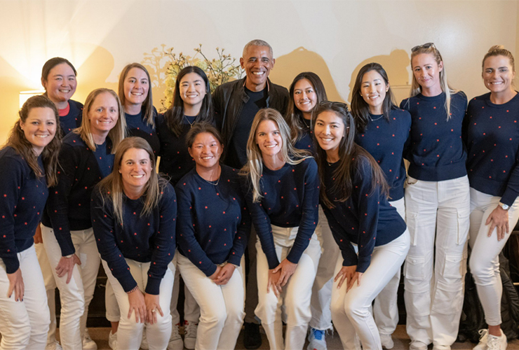 The U.S. Solheim team received some presidential encouragement Monday ahead of the Solheim Cup. Former President Barack Obama surprised the team during their dinner, wishing them good luck ahead of the matches that begin Friday at nearby Robert Trent Jones Golf Club.