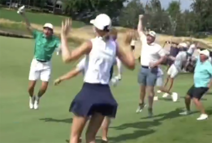 The shot lands right behind the green and slowly but surely starts to roll back to the pin. It takes a while to get there, which only boosts the anticipation and eventual explosion. It even waits an extra second hanging on the edge of the cup before finally falling.