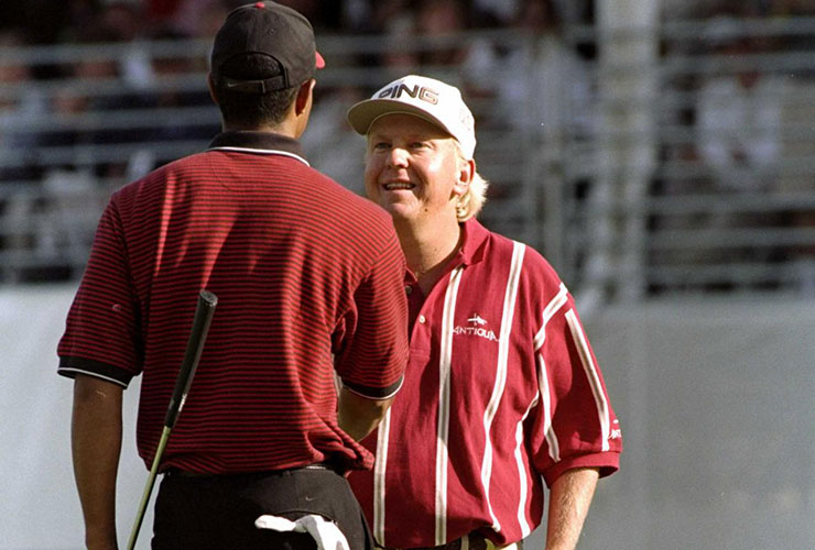 With Riviera hosting the US Senior Open later in the year, the Nissan Open was moved to Valencia Country Club. The change in venue didn’t change Woods’ fortunes. In the midst of undertaking his first significant swing changes, Woods shot weekend scores of 65-66 to finish in a tie with fellow Californian Billy Mayfair at 12-under 272. Mayfair had to birdie the 72nd hole in regulation and then birdied it again on the first playoff hole after Woods missed the fairway on the par-5 18th and was forced to lay up, eventually settling for par. Twenty years later, Woods admitted that the loss, his only blemish in 12 career playoffs, still bugged him.