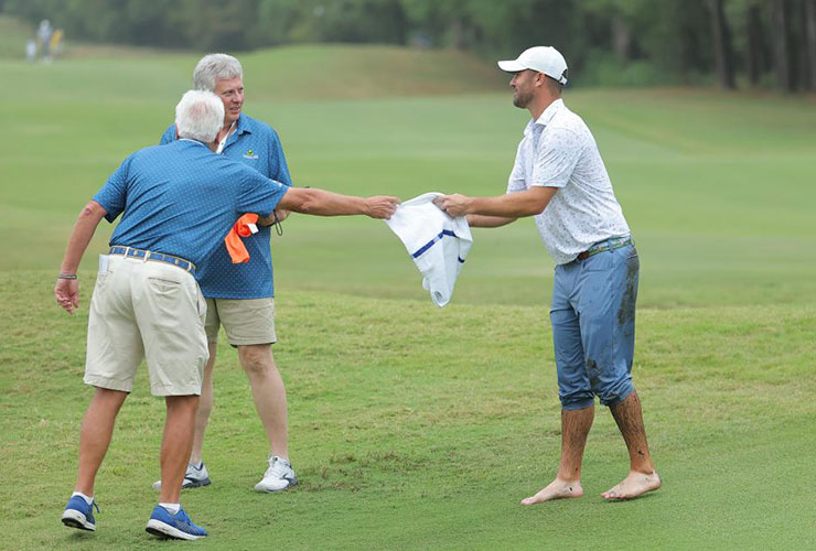 Deciding he couldn’t leap back over the creek, Bryan removed his shoes and began to wade into the water. But then he fell on his butt. “Oh God,” he said. “What a disaster.” With some assistance from his caddie, Bryan made his way back to the hole and two-putted for a wild par with his mud-stained trousers rolled up to his knees (apparently that’s allowed on tour even if shorts still aren’t). Have a look for yourself: